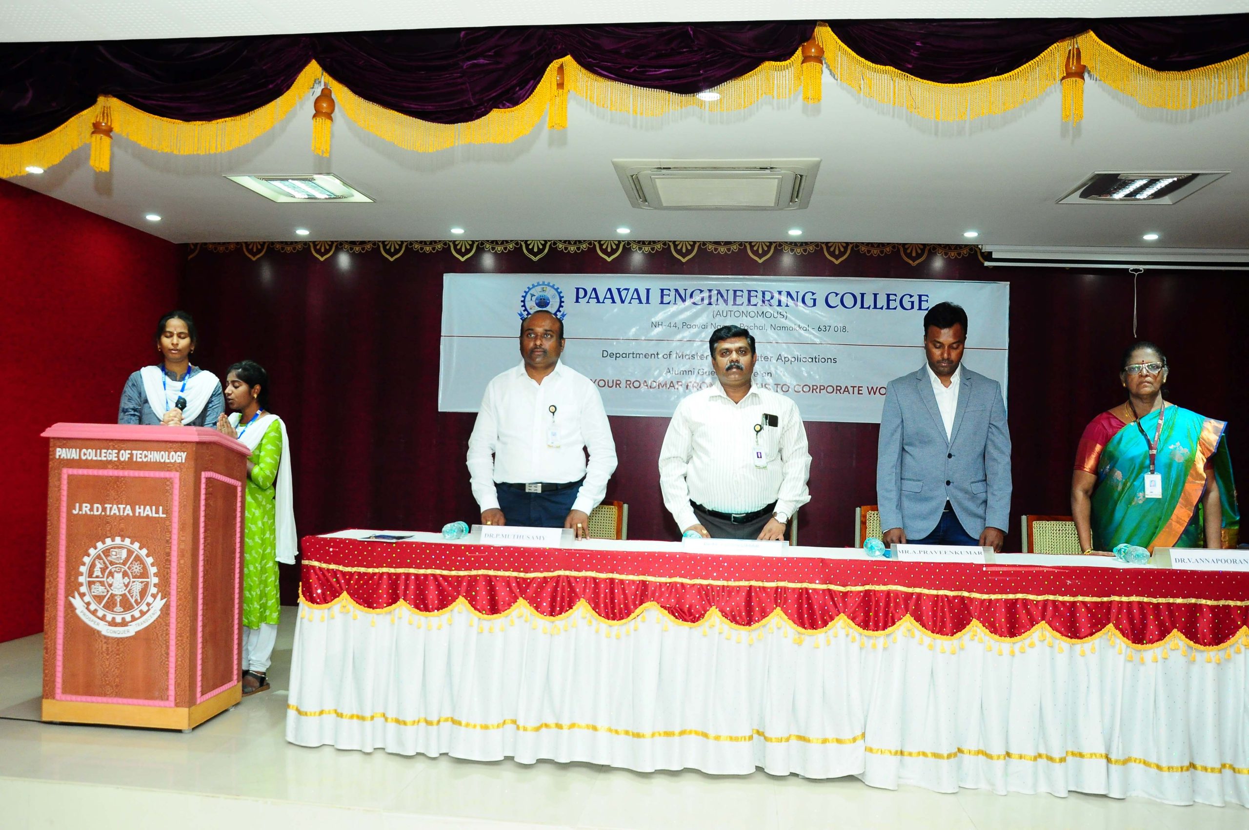 The department of MCA had organized a one day Alumni Guest Lecture Series on “Crafting Your Roadmap from Campus to Corporate Word” on 09th December 2023. Mr. A. Praveenkumar, Technical Project Manager, Tata Consultancy Services, Bengauru, was the Alumni Speaker at the function. The function started with a divine note along with a prayer song. Ms. S. Keerthi, I-Year MCA, welcomed the gathering. The function was presided over by Dr. M. Premkumar, Principal, Paavai Engineering College and the alumni speaker was introduced by Ms. R. Seva Varshini, I-Year MCA.