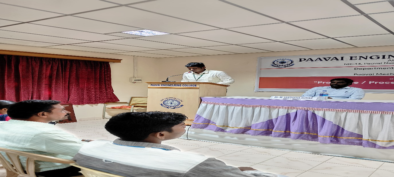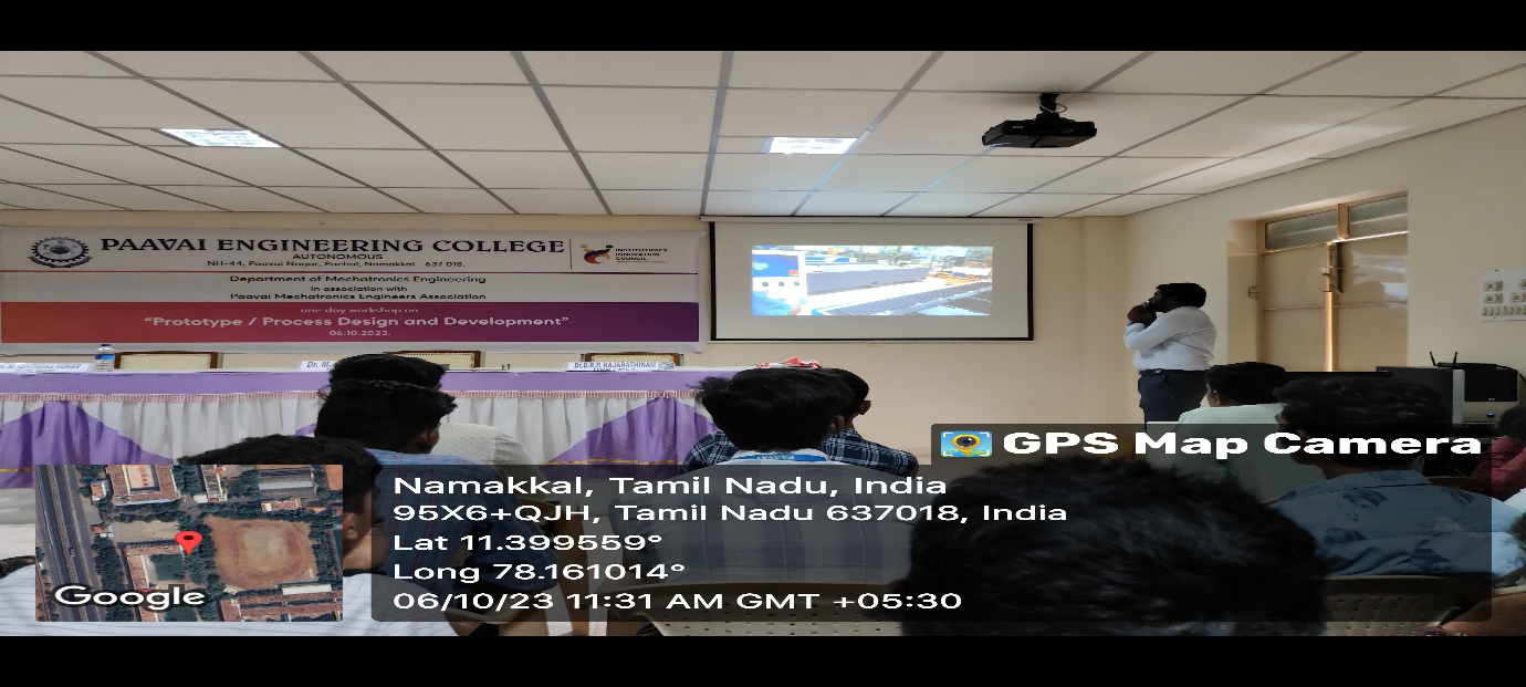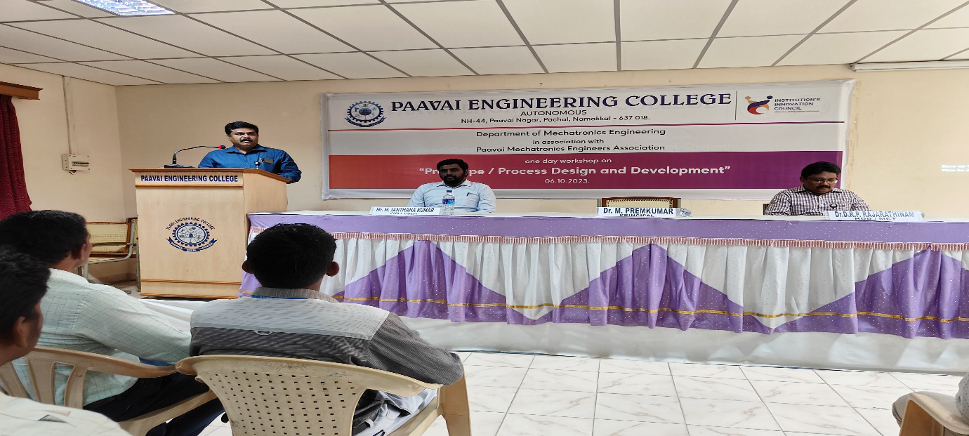 The department of Mechatronics and Paavai Mechatronics Engineers Association of Paavai Engineering College organized a one-day workshop titled on “Prototype / Process Design and Development” on 06th October 2023.Mr. M. Santhana Kumar, Design Engineer, Sri Vedha Engineering, Coimbatore was the guest speaker. The workshop aimed to provide participants with a better understanding of how to turn their innovative ideas into practical solutions. Mr.M. Santhana Kumar explained how to navigate the journey from ideation to execution, highlighting the importance of maintaining a simple-to-complex business concept while developing a product. Attendees gained an understanding of the challenges associated with the product development process and the necessary steps involved in taking a concept to market.