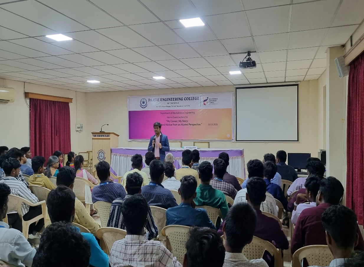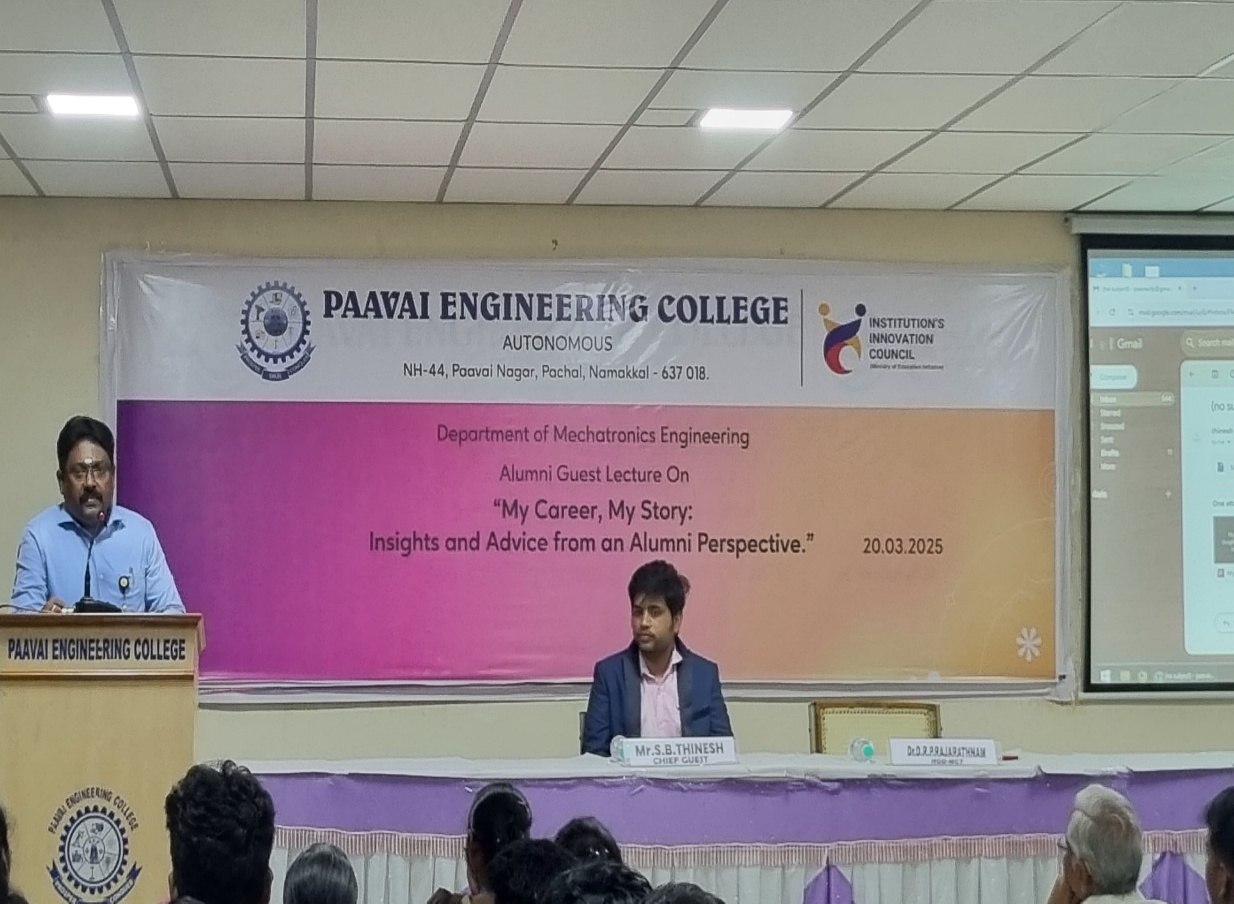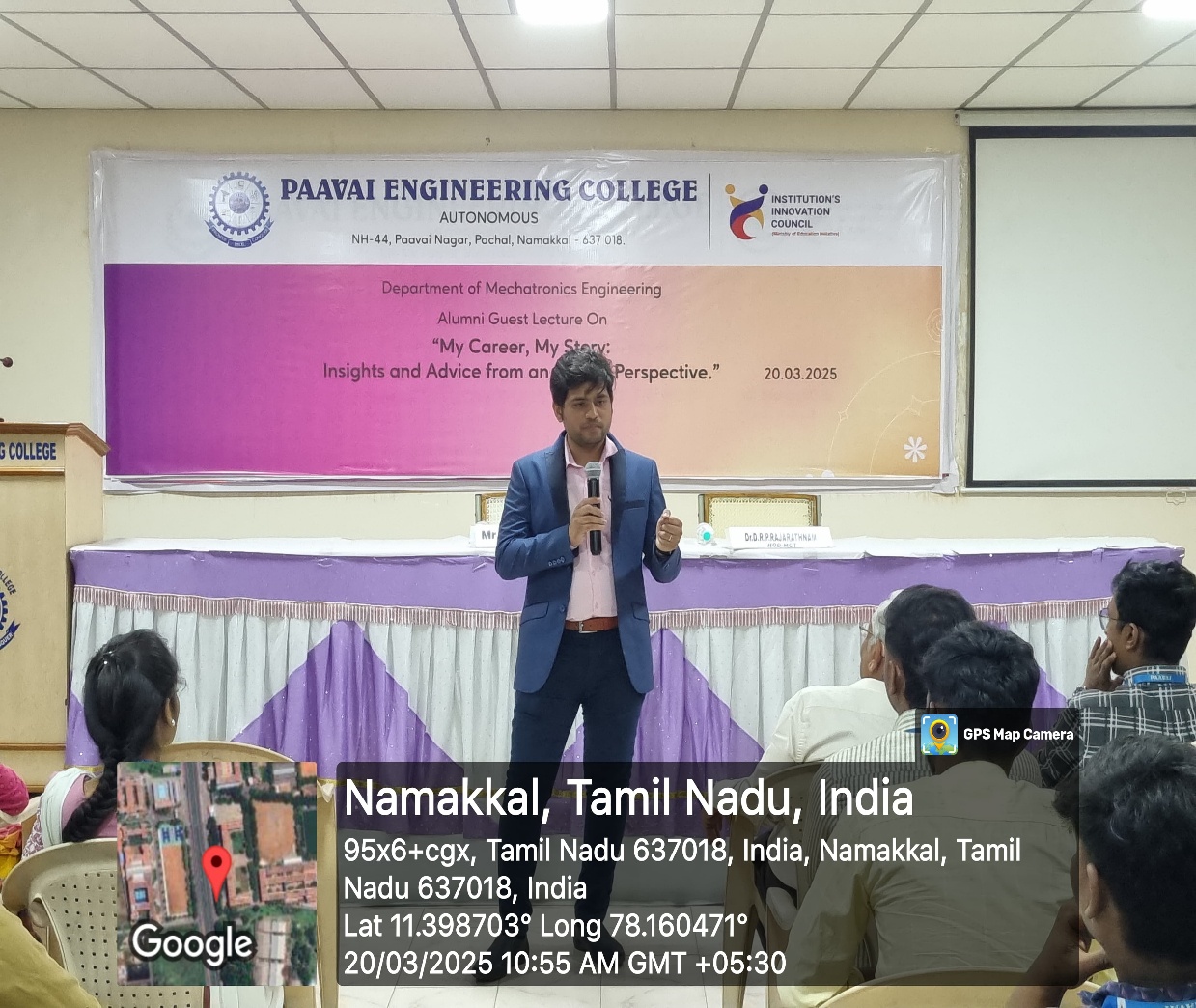 The Department of Mechatronics Engineering at Paavai Engineering College organized an alumni guest lecture on “My Career, My Story: Insights and Advice from an Alumni Perspective” on March 20, 2025. The session aimed to provide students with first-hand insights into career pathways, industry expectations, and professional growth from an experienced alumnus.