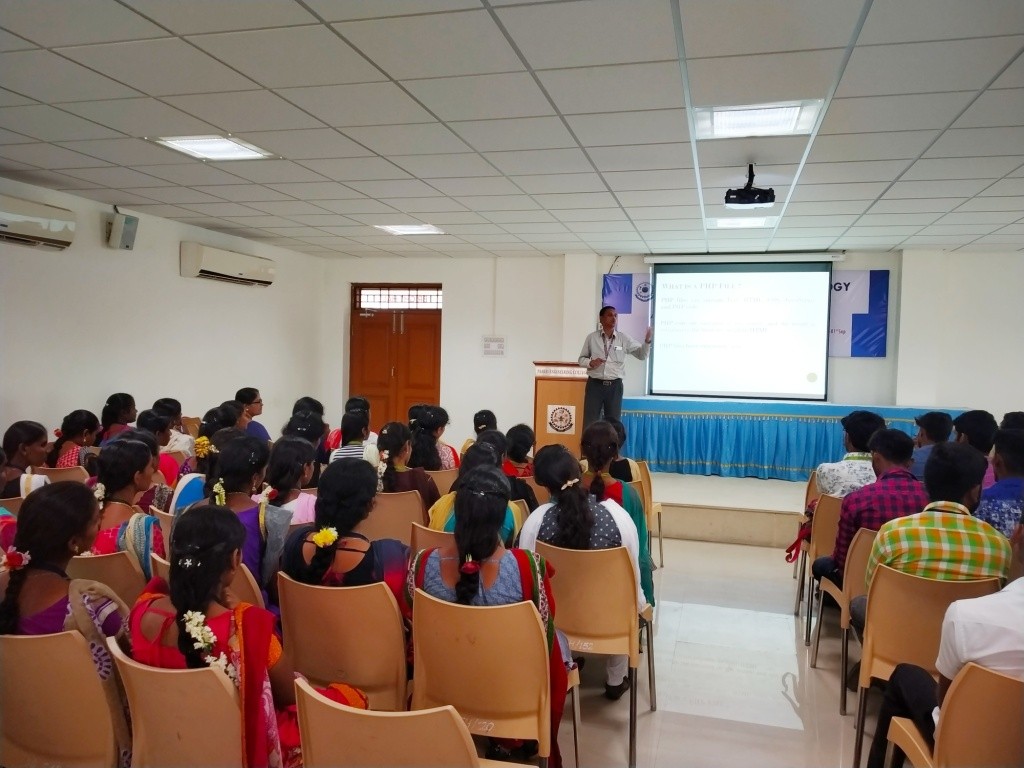The department of MCA organized a one day workshop on “Recent Trends in Computer Technology” on 25th January 2019. The function started on a divine note with prayer song. Ms.P.Kokila of second year MCA welcomed the gathering. The function was presided over by Dr. P.Muthusamy, Head of Department, Master of Computer Applications, Paavai Engineering College. The opening session, “PHP with MySQL” was handled by Mr.Senthilvelan, Professor, Department of MCA, Paavai Engineering College. He briefed about PHP Introduction, Environment Setup, Syntax, Variable Types, Constants, Operator Types, Decision Making, Loop Types, Arrays, Web Concepts and PHP-MySQL Database Connectivity with examples. Session 2 dealt with “Big Data Analytics & Hadoop” by Mrs.V.Annapoorani, Assistant Professor, Department of MCA, Paavai Engineering College. She focused on the area such as Big Data, Big Data Technology, Data Explosion, Data Measurements, Data Warehouse, Issues on Legacy Systems, Hadoop, Companies using Hadoop, Hadoop Architecture, Hadoop Server Roles, Hadoop Core Services, Hadoop Distributed File System (HDFS), HDFS Blocks, Operations, Architecture and Map Reduce Architecture with examples. Session 3 was about “Agile Methodologies” handled by Mr.C.Rathnakumar, Assistant Professor, Department of MCA, Paavai Engineering College. He gave detailed information about Agile Methodologies Introduction, Traditional Approach, Agile Software Development, Agile Values, Agile Principles, Traditional Vs Agile model, Classification of Agile Methods, Limitations of Agile Methodologies and Reduce Limitations using components with development examples. Session 4 concentrated on “Cloud Computing” by Dr. P.Muthusamy, Head of Department, Master of Computer Applications, Paavai Engineering College. He gave some detailed information about Introduction to Cloud Computing, Characteristics, Underlying Components of Cloud Computing, Grid Computing, Virtual Machine (VM), Commercial Cloud Offers Organizations and Benefits of Cloud Computing. Then, he demonstrated Cloud Models like SaaS, PaaS, IaaS and their services, Issues and Challenges of Cloud Computing with example models and applications in the cloud environment. The function ended with vote of thanks by Mr.S.Shreedhar, second year MCA. Heads of various Departments, Professors, and Faculty members actively participated in the progamme and made it a grand success. Students from various Arts and Science colleges located in Salem and Namakkal and our MCA students participated with full zeal and were benefitted by this programme.