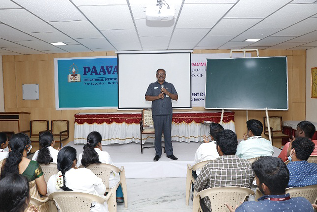 Mrs.Jayalakshmi, Dean, Counseling, illustrated that “Teachers are Real Parents” by citing various lifetime incidents. She shared her experiences to deal with the slow learners in the classroom. Dr.K.K.Ramasamy, Director Administration, expounded on the different roles and responsibilities of the teachers. He advocated the practical methods of teaching to reach out to the students of all categories. He also stressed the importance of observation skill which should be developed by the teachers. He highlighted that knowledge of the fundamentals, good communication skills, keen observation and a pleasant attitude should be practiced by the teachers to improve their teaching skills. Various examples related to different branches of study and environments were explained. Dr.K.Selvi, Dean, Academics, PEC explained the significance of Paavai Culture, Paavai Mantra and Paavai beliefs. Dr.M.PremKumar, Principal, PEC, emphasized the importance of developing a right attitude to serve as worthy members of Paavai. He explained that. ‘One’s attitude determines one’s Altitude’. Dr.B.Murali Babu, CoE elaborated on the significance of ‘Triple S relationship’. He stated that the relationship of a faculty member with the students, other staff members, and superiors should have the line of boundary to maintain a healthy relationship. Dr.J.Murshitha Banu Professor and Head, FDD elaborated on the importance of English language and communication skills. She further highlighted the various skills for developing English language.