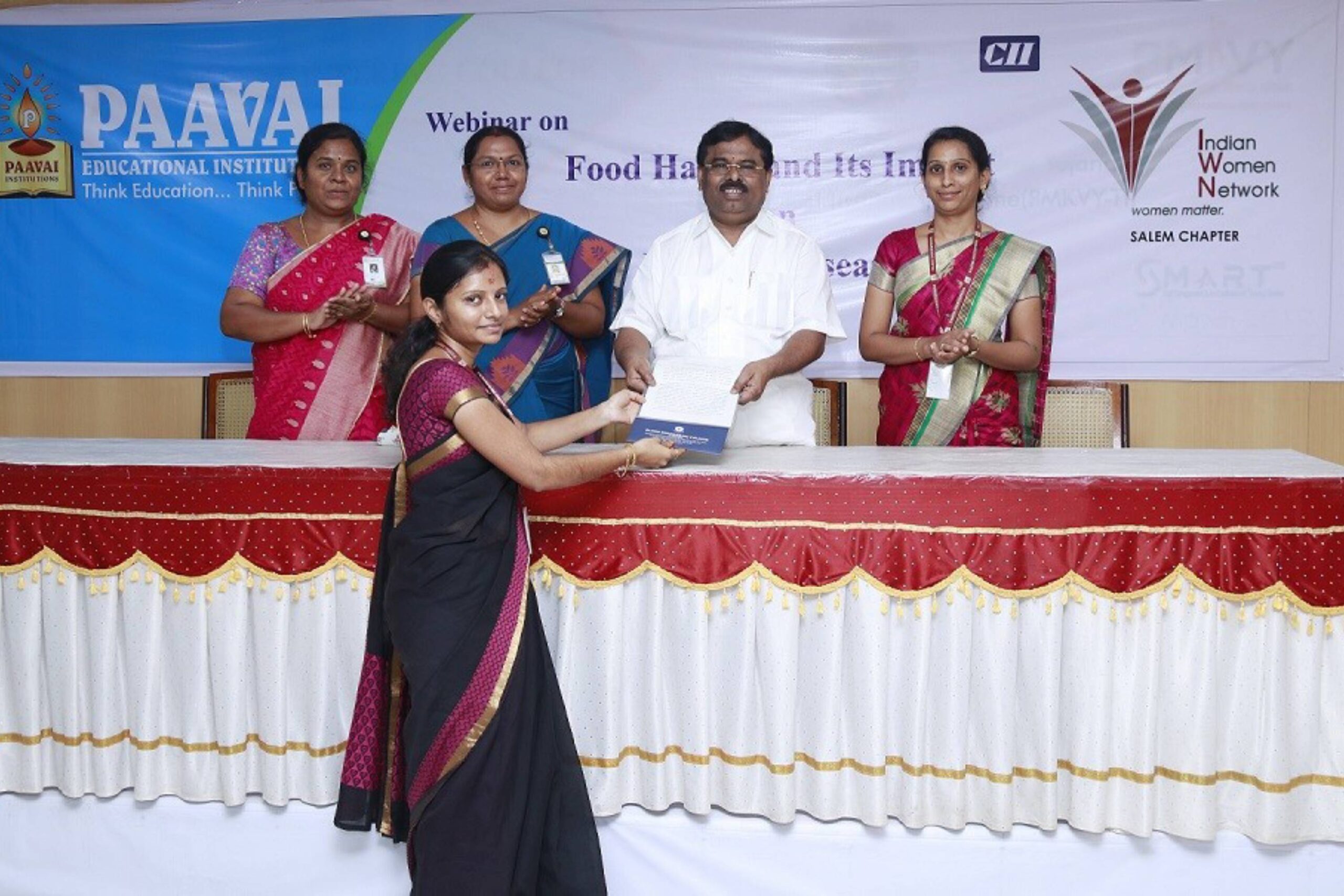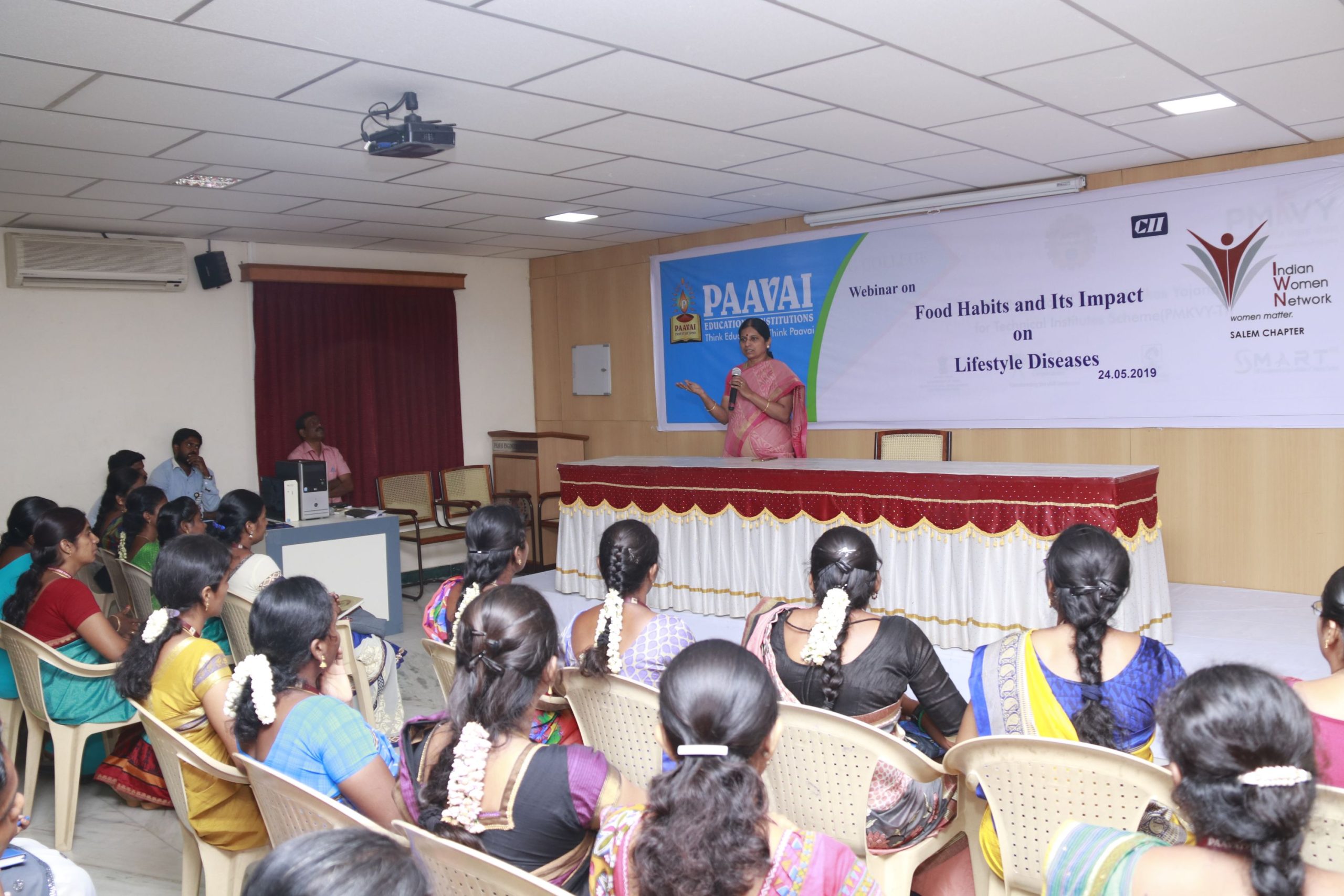 Paavai Institutions and CII Indian Women Network jointly organized a Webminar on “Food Habits & its Impact on Lifestyle Diseases” on 24 .05.19, friday at 3.00 p.m. to 4.30 p.m. CA.N.V.Natarajan, Chairman, Paavai Institutions presided over the function and inaugurated the webminar. The session created awareness about the food habits of the individual and detailed about the different types of diseases. The facilitator is Dr. Yamini Prakash, Chief Dietician at Kauvery Hospitals; Chennai briefed on the food fundamental rudiments like carbohydrates, proteins, fats, minerals, vitamins, macro and micro nutrients which is essential for a healthy body. Each diet has varying restrictions on the types and amounts of carbohydrates intake of an individual. She also explained on low carbs and high carb food. Vegetables, fruits, legumes, and whole grains foods are generally healthy. Refined carbs include sugar-sweetened beverages, fruit juices, pastries, white bread, white pasta, polished rice usage should be minimized. She also added that rainbow coloured food items such as carrot, greens, etc., give the essential nutrients. Eggs are perfect proteins since they contain complete, high quality protein. She insisted to consume a balanced diet and advised not to reduce weight by fasting. Weight reduction should be gradual. Faculty members had queries session for half an hour and the doubts were cleared by the dietician. The chairman distributed the pamphlet of the webminar to the faculty members. Many women faculty members from Paavai Institutions participated in the webminar and benefitted.
