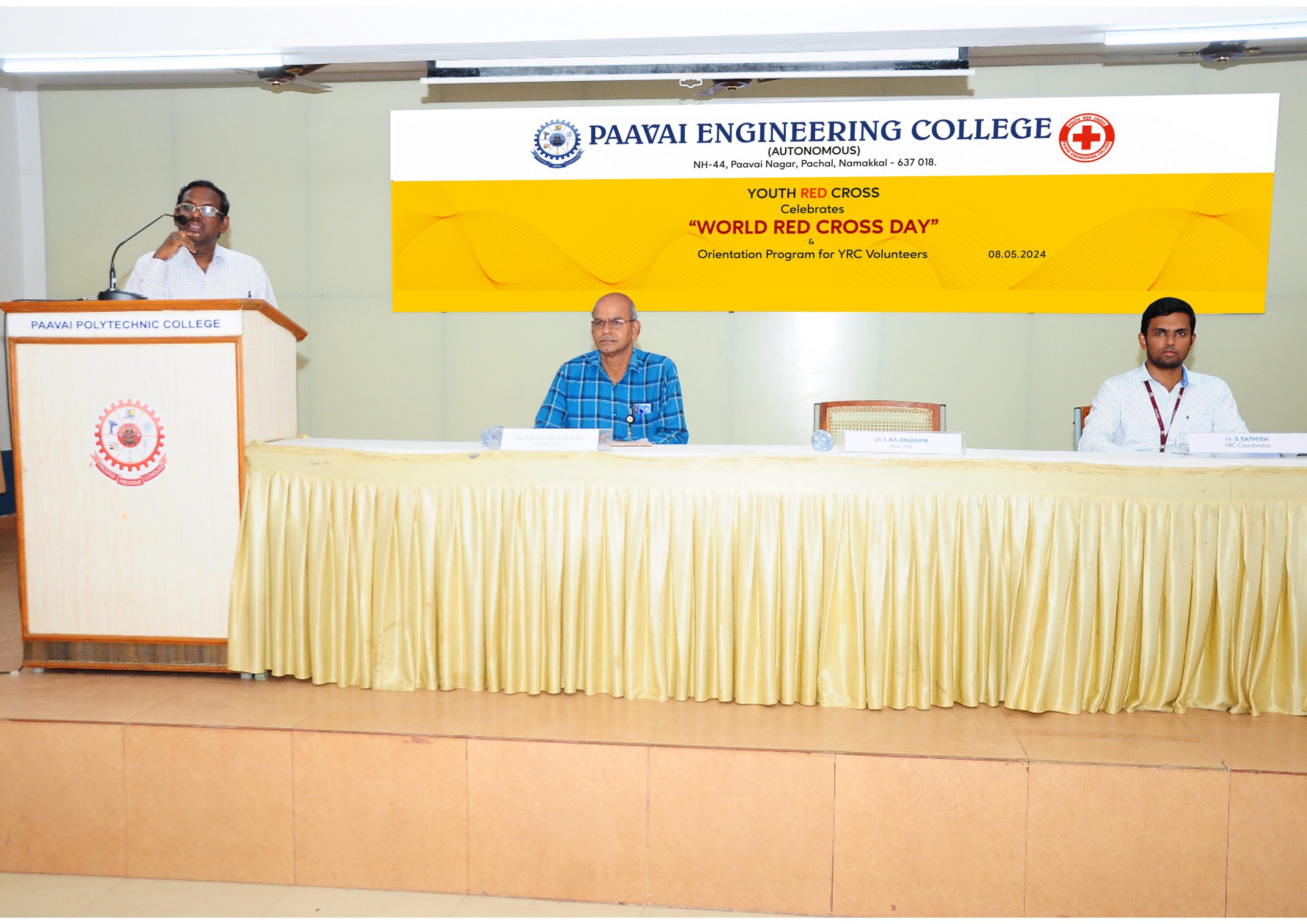 The Youth Red Cross of Paavai Engineering College is celebrates “World Youth Red Cross Day” on 08th May 2024 in Visvesvaraya Hall between 09:15 a.m. to 12.30 p.m. The inauguration started with a prayer song. The welcome address was given by K. Udhayavanan from Third year Pharmaceutical. Dr. M. Premkumar, Principal of Paavai Engineering College gave the presidential address and explained the need of service to others, shared his experiences as a volunteer during his college days and being a part of various social services. Special address was given by Dean R&I Dr. I.Rajendran and Mr.P.S.Venkatesh, Principal of Paavai Collage of Engineering. They have insisted the responsibilities of a volunteers.